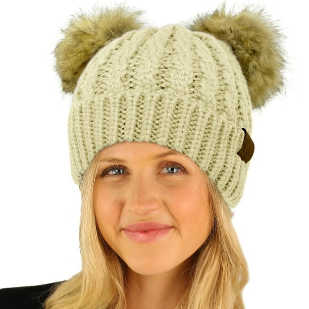 Cc Winter Cute 2pom Pom Ears 2tone Soft Warm Thick Chunky Knit Beanie Hat Faux Fur Solid Beige Walmart Com